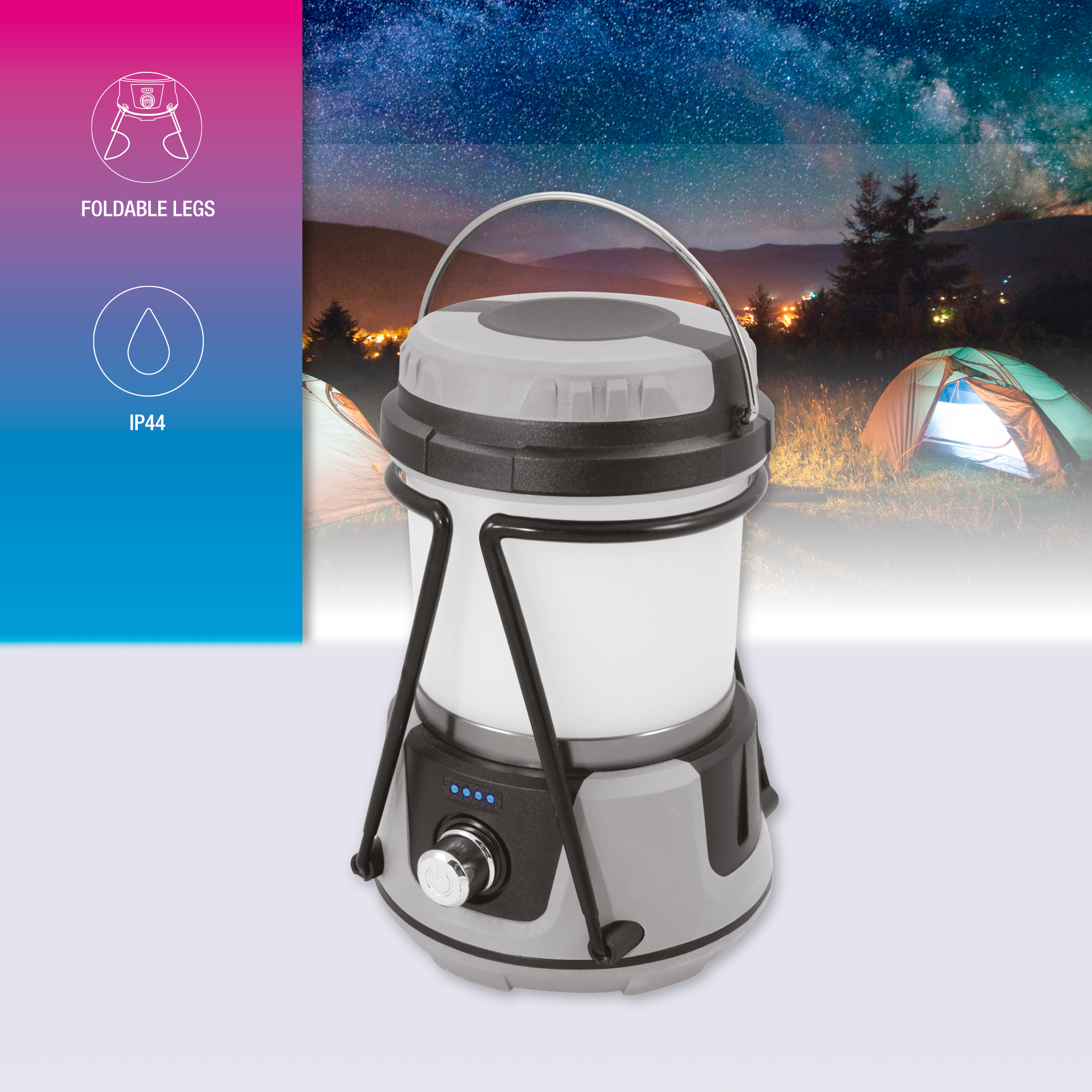 IP44 stupanj zaštite jamči sigurno korištenje u vlažnim uvjetima, a funkcije prigušivanja svjetla, izmjene temperature svjetla, crvena bljeskalica, kao i funkcija prijenosnog punjača za elektroničke uređaje omogućavaju široku primjenu proizvoda u različitim situacijama