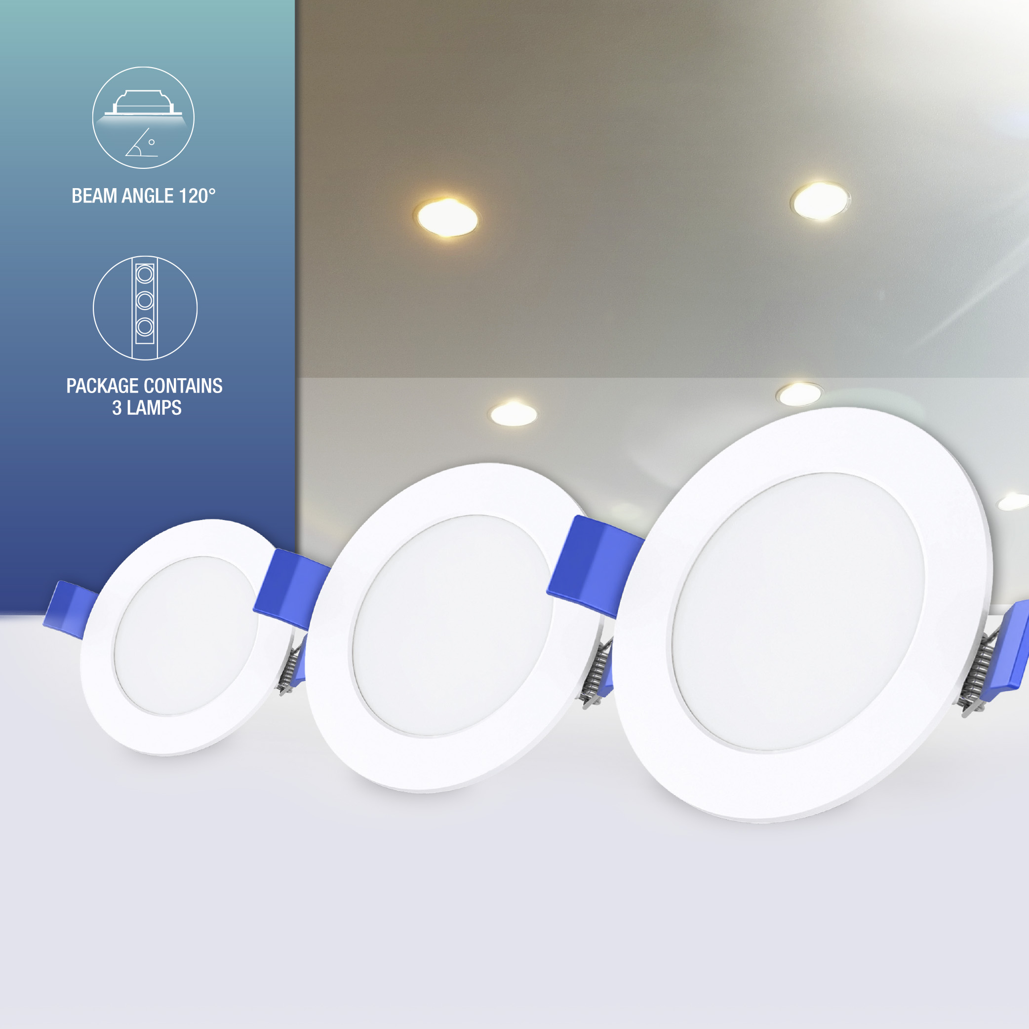 LED ugradbene svjetiljke – downlights, ugrađuju se u otvor promjera od 70-80 mm. Mala potrošnja od svega 3 W pruža ugodno osvjetljenje od 270 lm u toploj ili neutralnoj temperaturi svijetla. Pakiranje sadrži 3 svjetiljke.