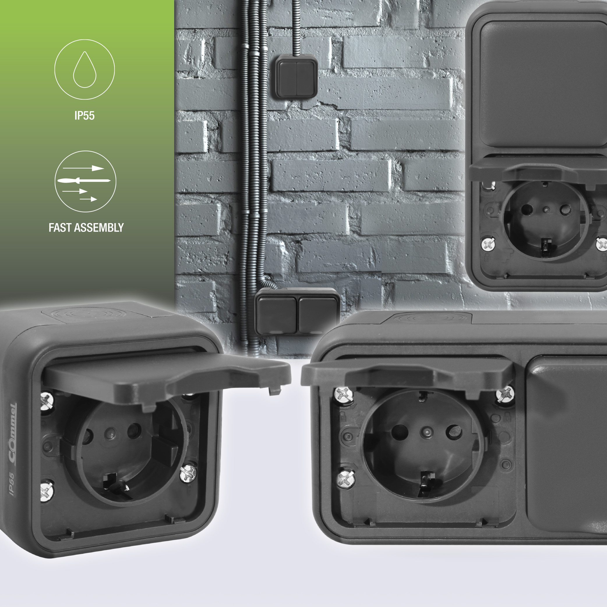 Commel nadžbukne instalacijske utičnice ističu se vrhunskom kvalitetom izrade i modernim dizajnom u atraktivnoj antracit boji. Zahvaljujući IP55 stupnju zaštite pogodne su za ugradnju u vrlo vlažne prostore ili na otvorenom. Inovativni sistem bez vijaka omogućava iznimno brzu montažu i sigurno zatvaranje kućišta proizvoda. Gumirane uvodnice za kabel nalaze se s gornje, donje i stražnje strane kućišta.
