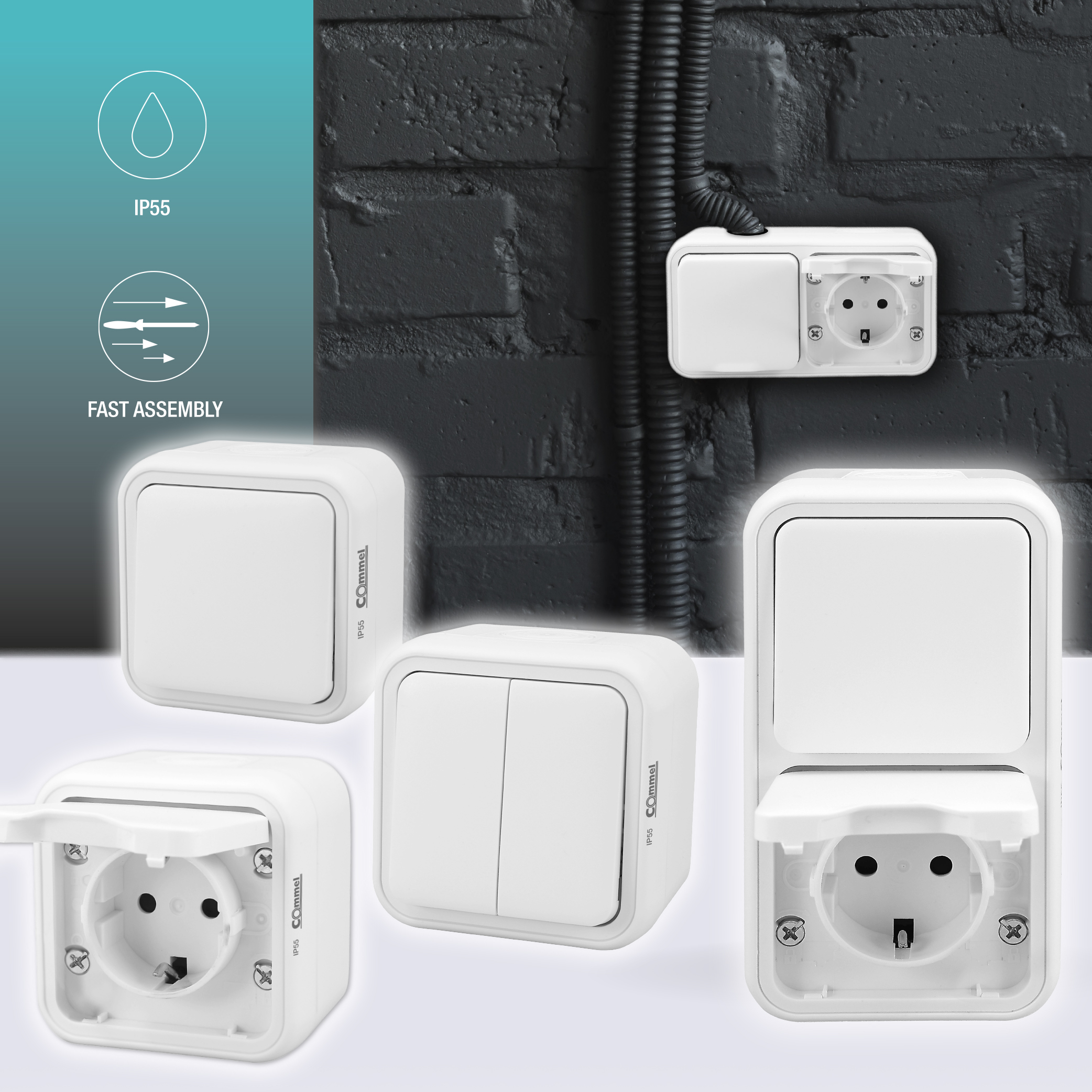 Commel nadžbukne instalacijske sklopke i utičnice ističu se vrhunskom kvalitetom izrade i modernim dizajnom. Zahvaljujući IP55 stupnju zaštite pogodne su za ugradnju u vrlo vlažne prostore ili na otvorenom. Inovativni sistem bez vijaka omogućava iznimno brzu montažu i sigurno zatvaranje kućišta proizvoda. Gumirane uvodnice za kabel nalaze se s gornje, donje i stražnje strane kućišta.