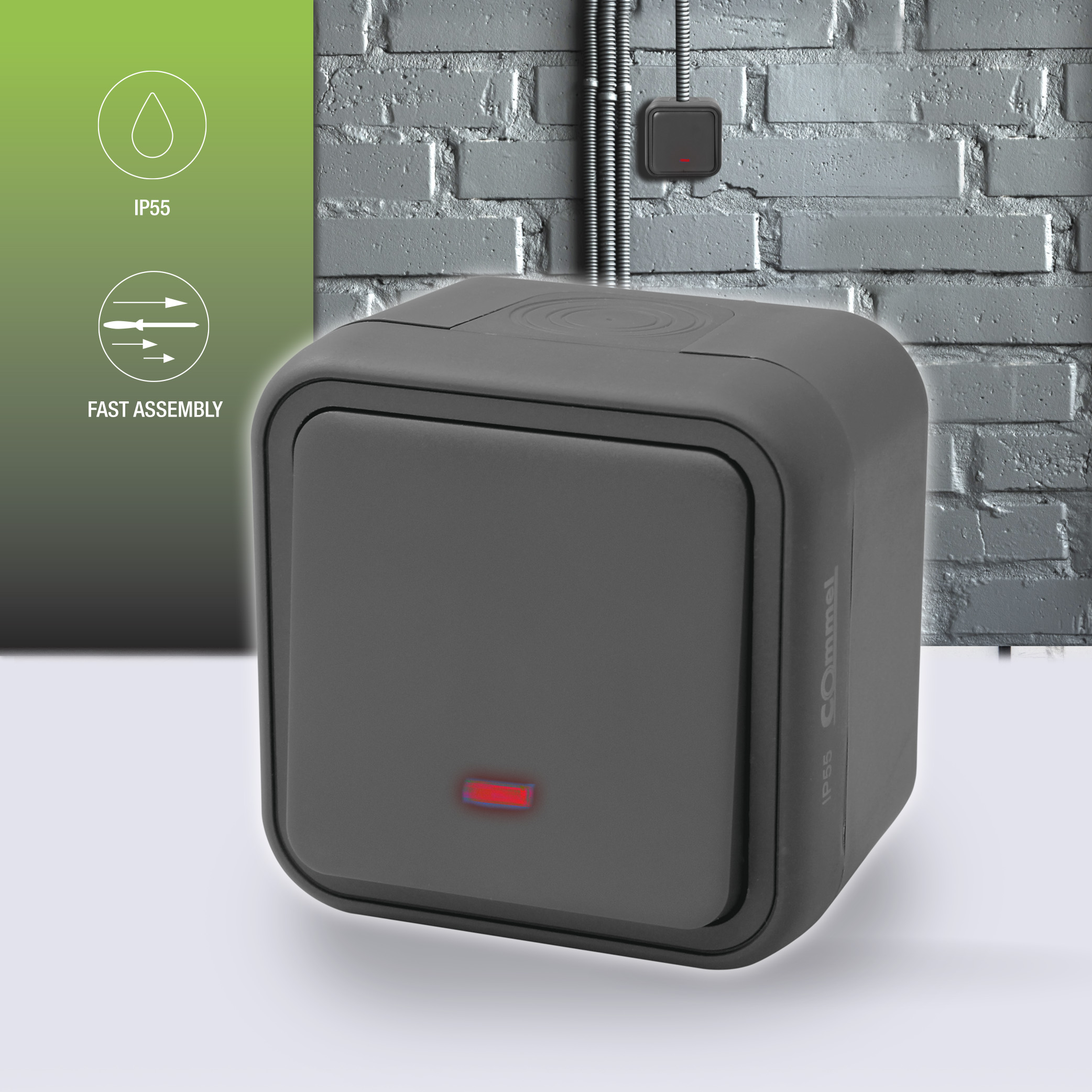 Commel nadžbukno tipkalo s LED indikacijom ističe se vrhunskom kvalitetom izrade i modernim dizajnom u atraktivnoj antracit boji. Zahvaljujući IP55 stupnju zaštite pogodno je za ugradnju u vrlo vlažne prostore ili na otvorenom. Inovativni sistem bez vijaka omogućava iznimno brzu montažu i sigurno zatvaranje kućišta proizvoda. Gumirane uvodnice za kabel nalaze se s gornje, donje i stražnje strane kućišta.