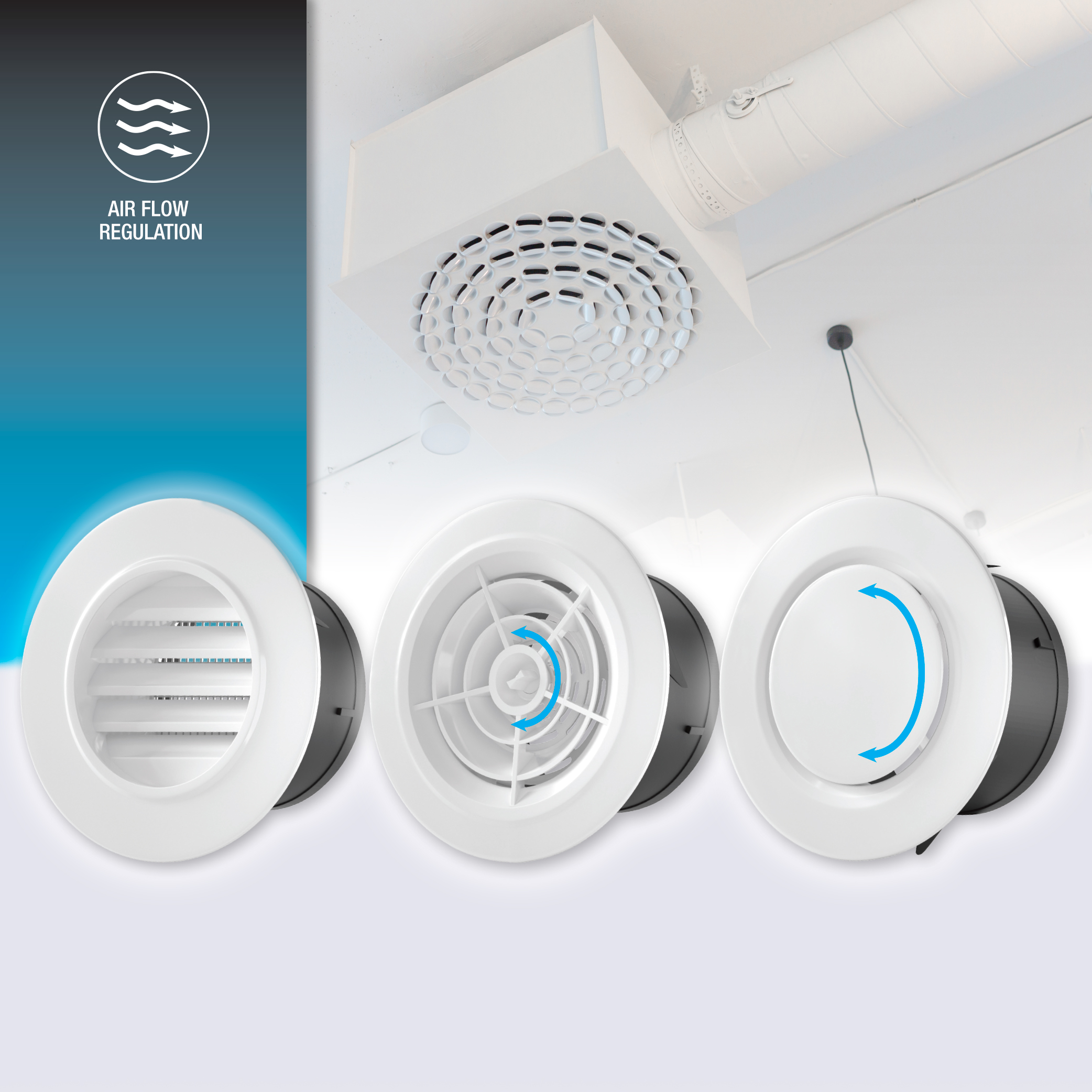 Poklopci ventilacijskog otvora promjera 100 mm u tri različita dizajna uklopit će se u svaki prostor. Modeli 420-902, i 420-903 imaju mogućnost regulacije protoka zraka.