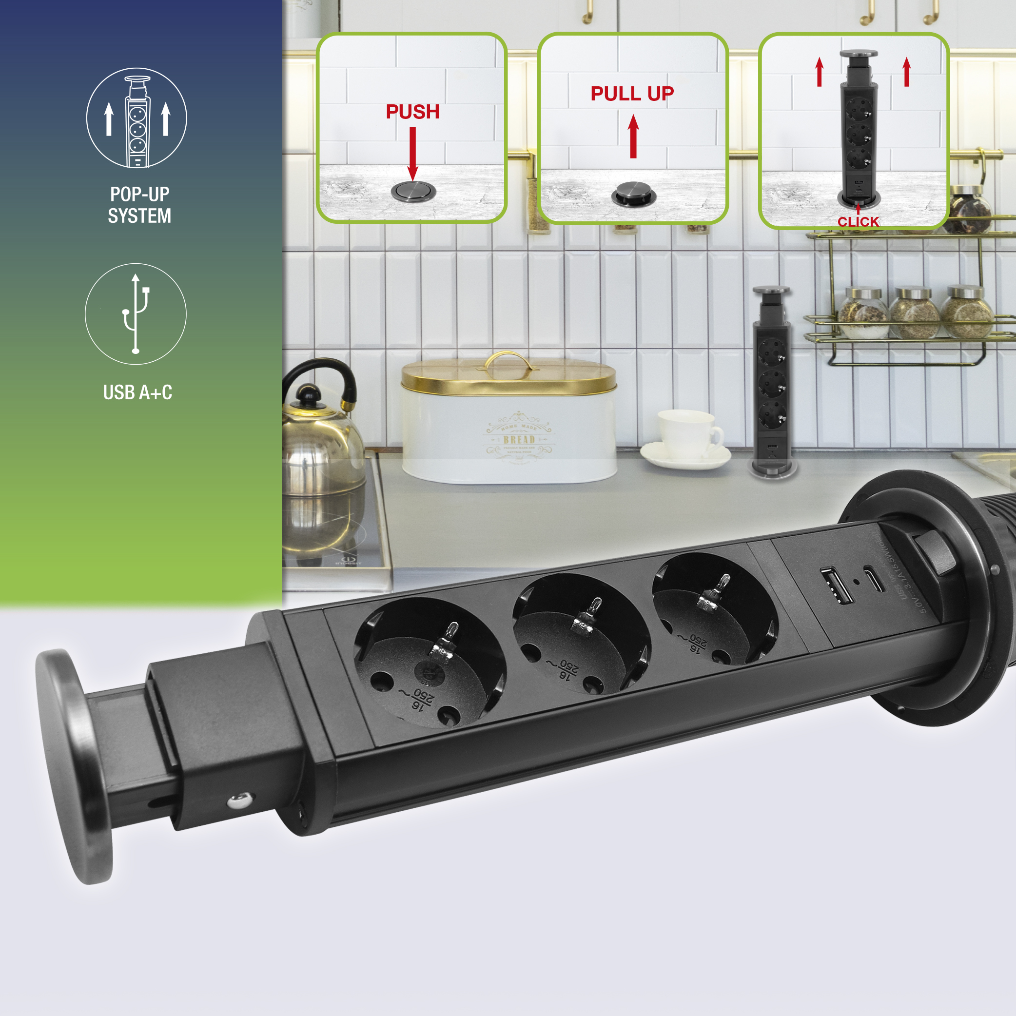 POP UP utičnica 235-121 je novi proizvod u asortimanu Commel ugradbenih utičnica. Moderan i elegantan dizajn, jednostavna ugradnja, 3 šuko utičnice i USB A +C čini ovaj proizvod poželjnim u svakoj kuhinji uredu ili na radnom stolu.