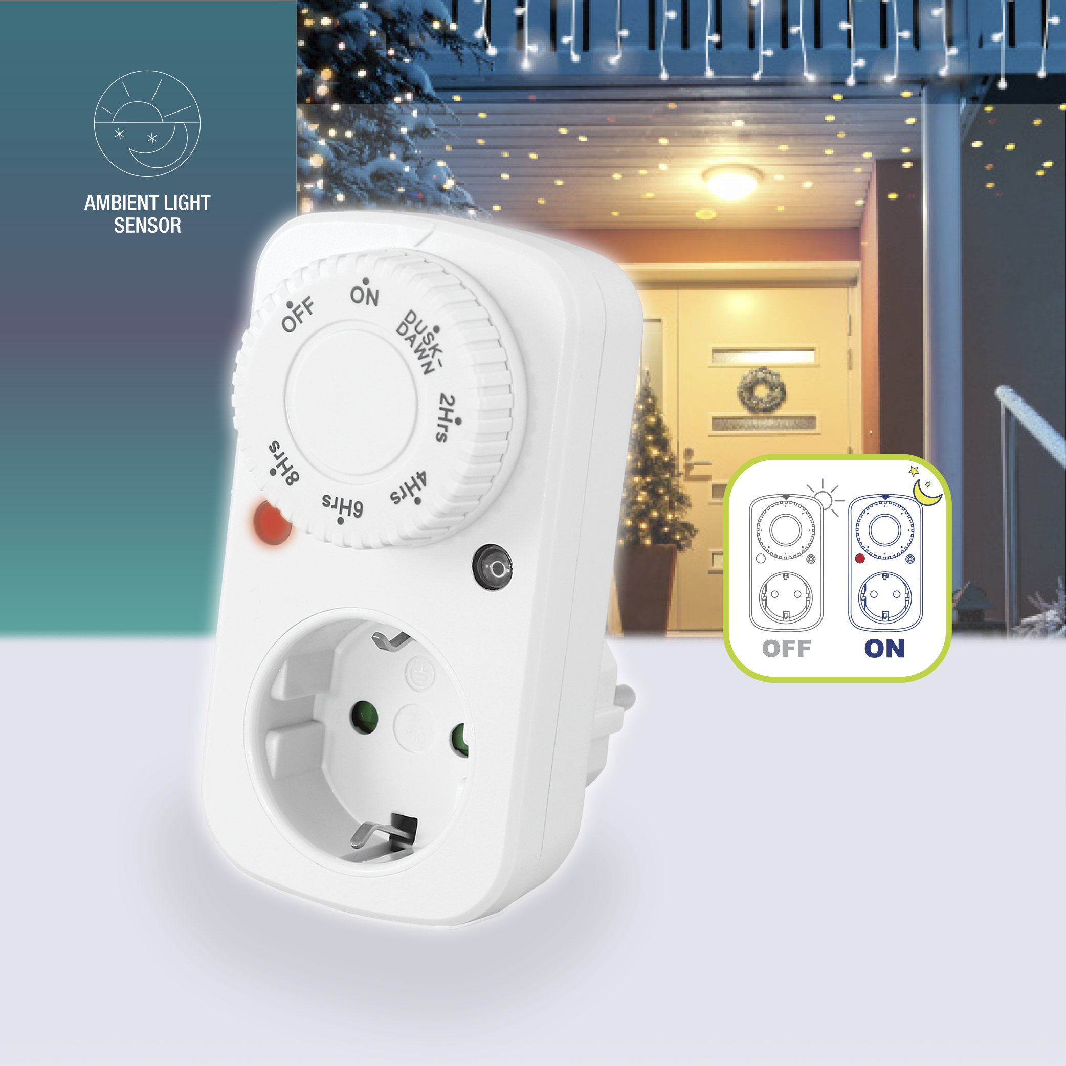 Proizvod je opremljen senzorom svjetla i ima mogućnost automatskog uključivanja priključenih uređaja ili rasvjetnih tijela pri niskoj razini ambijentalnog osvjetljenja.